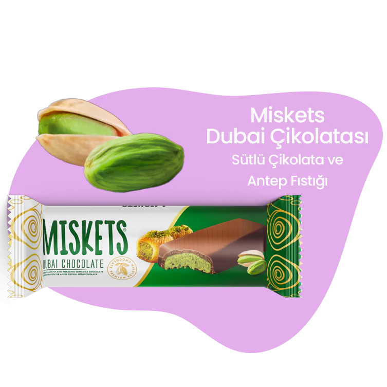 Miskets Dubai Chocolate offers a unique taste experience by combining its thin, crispy wafer texture with milk chocolate and pistachios. The rich pistachio aroma in every bite is perfectly balanced by the smoothness of the milk chocolate. Ideal both as a daily snack and for elegant presentations, this delightful treat stands out with its crunchy texture and stylish appearance.